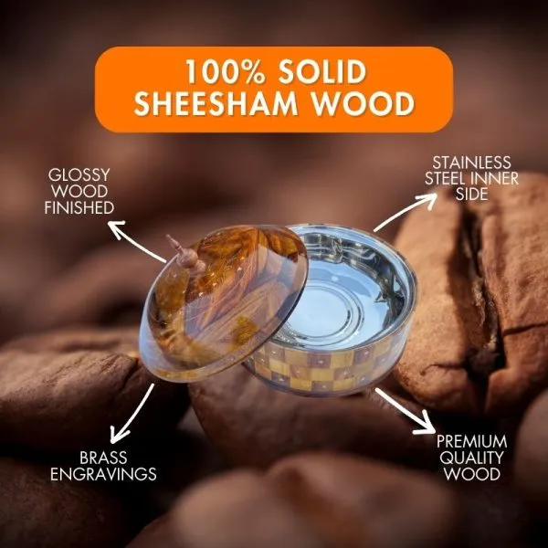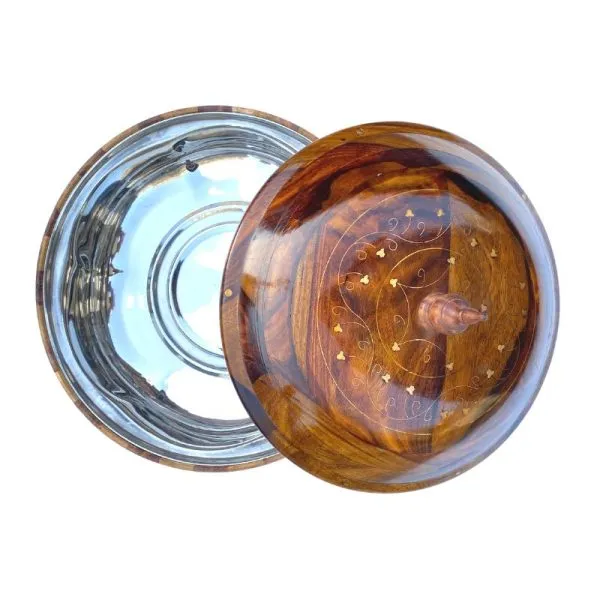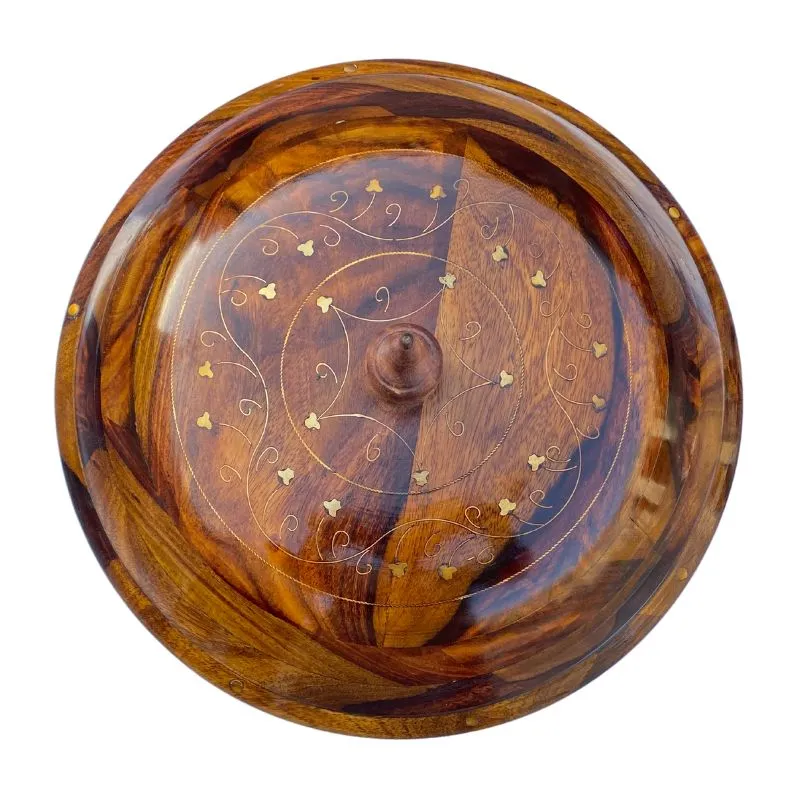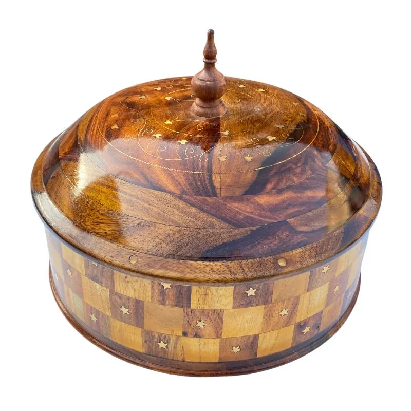 - A wooden hotpot made in Sheesham wood with brass inlay engravings on the sides and lid top.