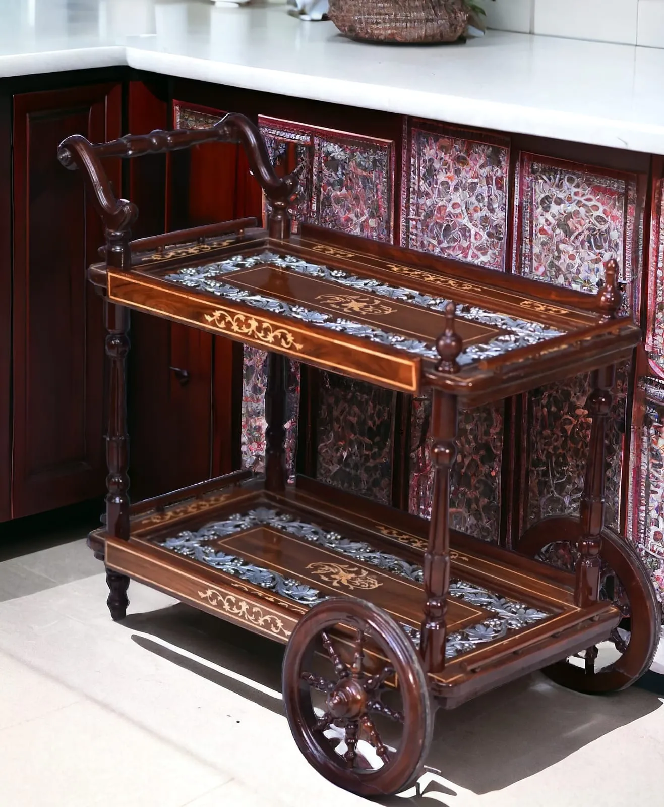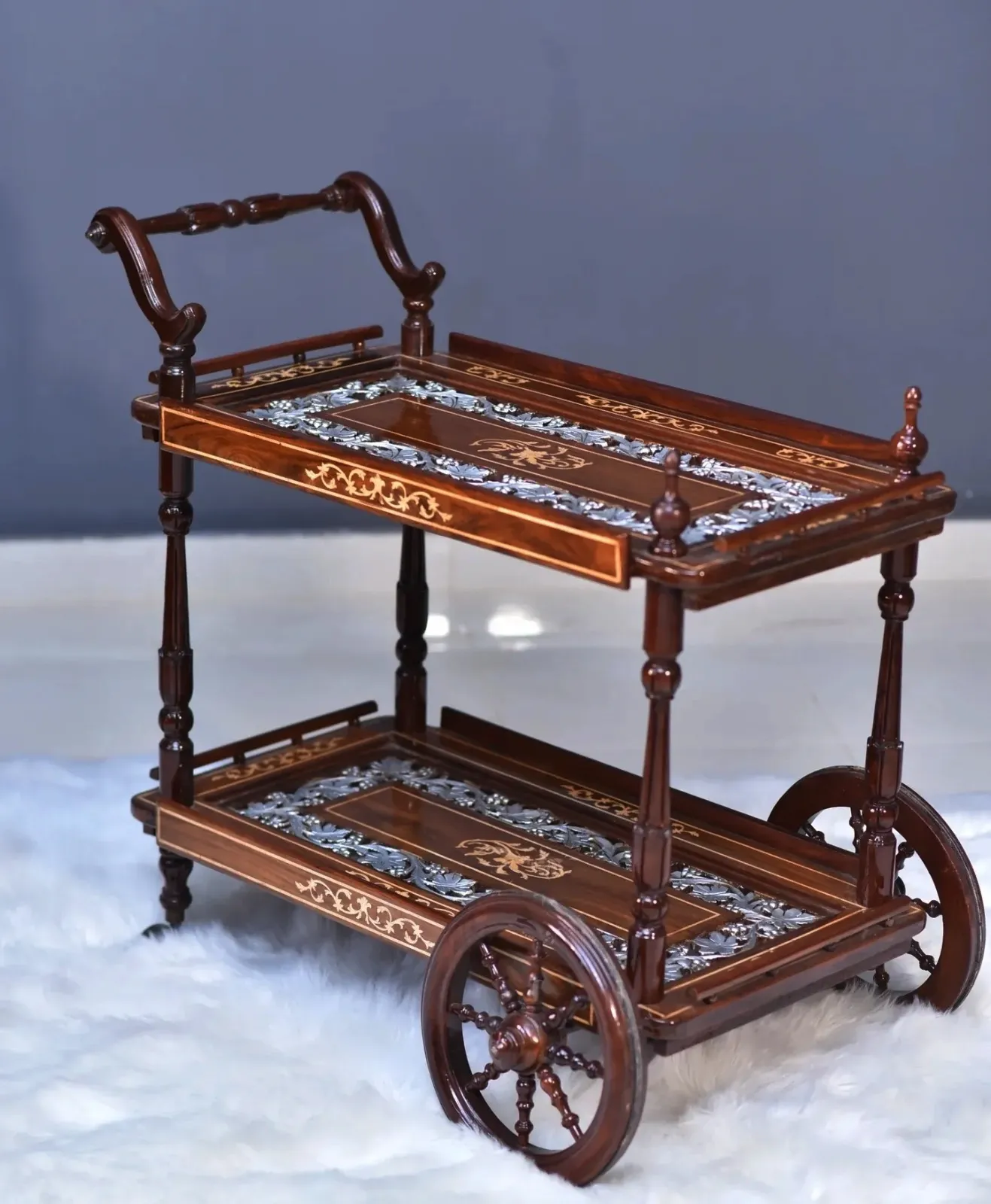 Elevate your home with the Wooden Tea Trail Inlaid Trolley, a masterpiece of craftsmanship and design. This exceptional tea trolley features intricate inlay work that adds a touch of opulence to its solid wood construction. The delicate patterns and rich finish make it a statement piece that complements any décor. Perfect for showcasing your finest tea sets and serving your guests in style, this trolley is a blend of art and functionality.