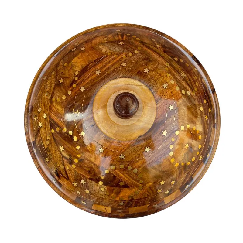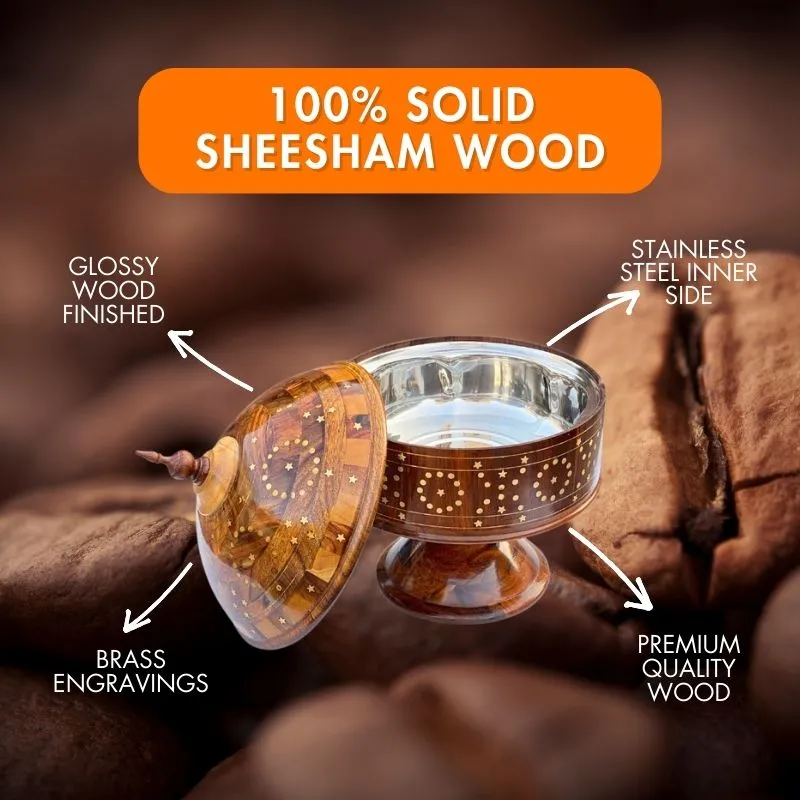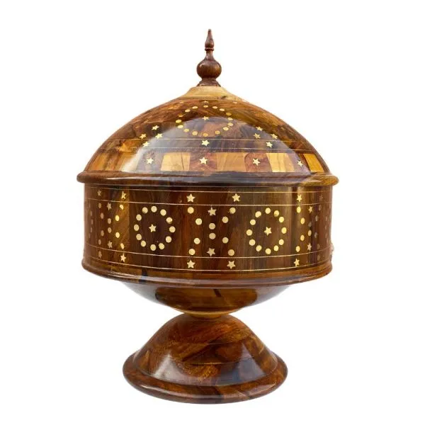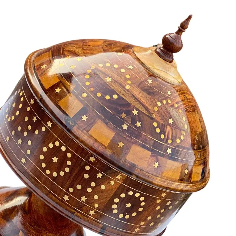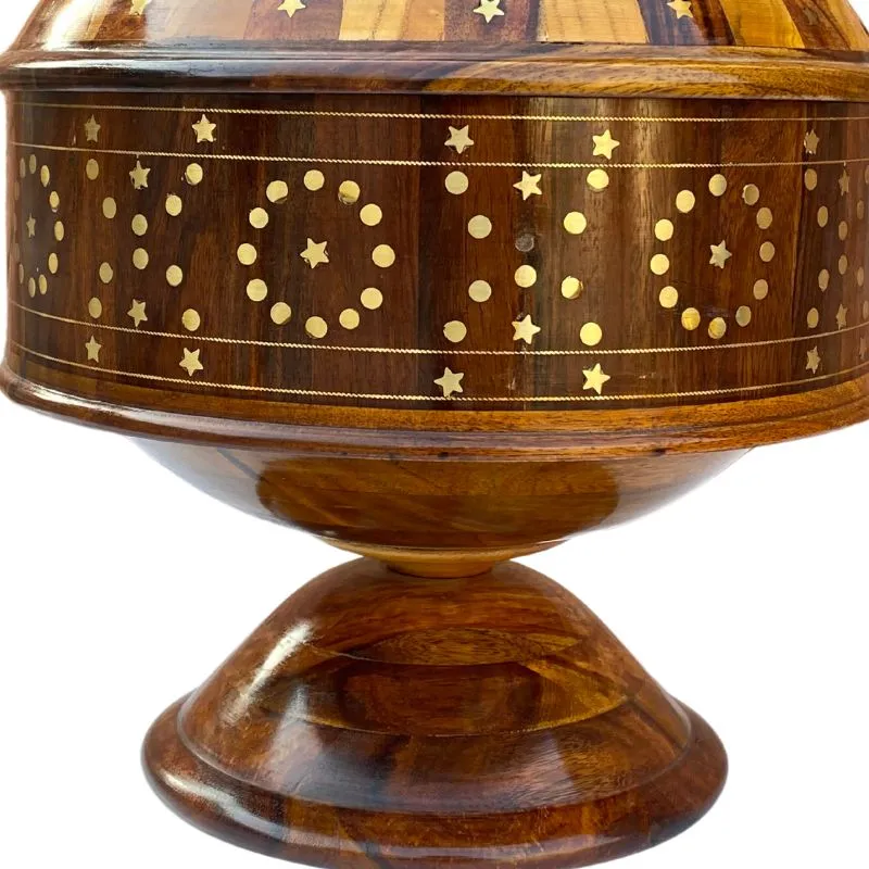 - A wooden hotpot made in Sheesham wood with brass inlay engravings on the sides and lid top.