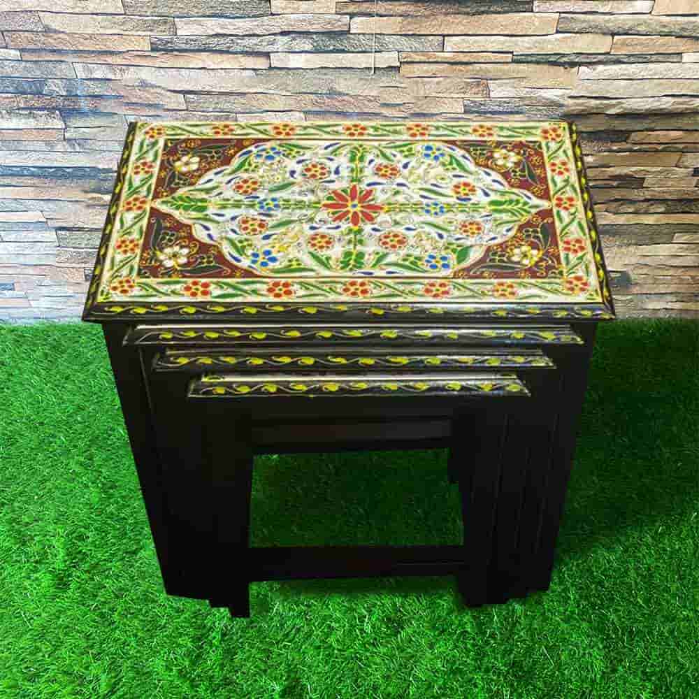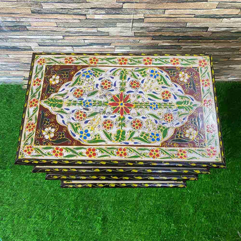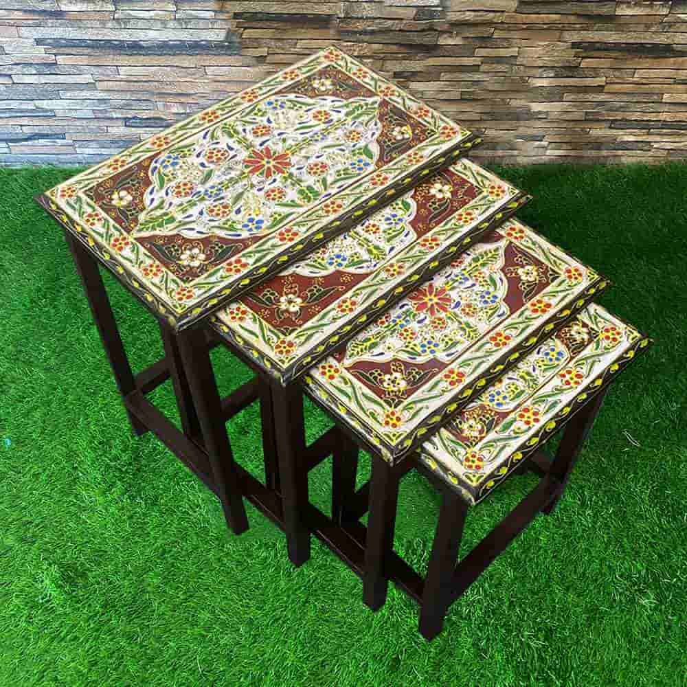 Features:Crafted From Wood with Brass Work.Hala Style Traditional HandcraftedSimple Traditional Design.Sleeky Straight LegsSet of 4. Dimensions:Large Table: 17.5″W x 11″D x 20″HExtra Large Table: 20″W x 12″D x 21″HMedium Table: 15″W x 10″D x 19″HSmall Table: 13″W x 9″D x 18″H