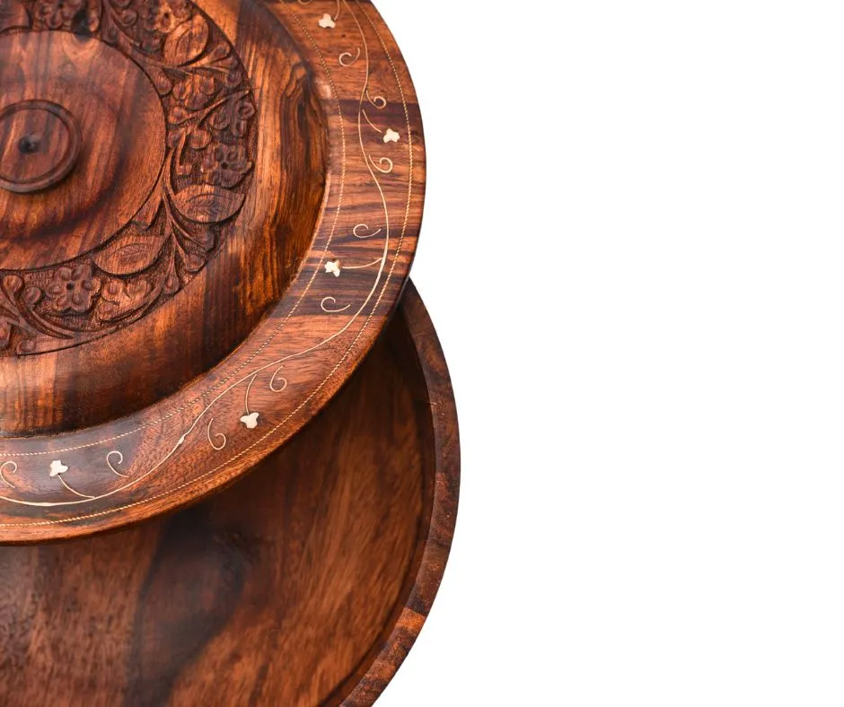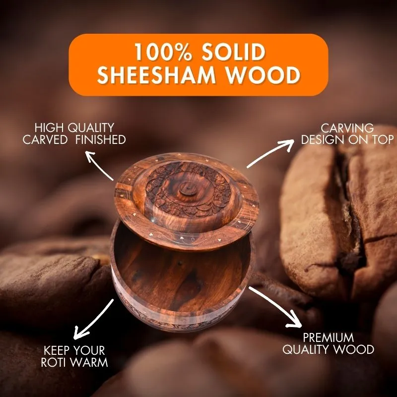 - A wooden hotpot made in Sheesham wood with brass engravings on the sides and lid top.