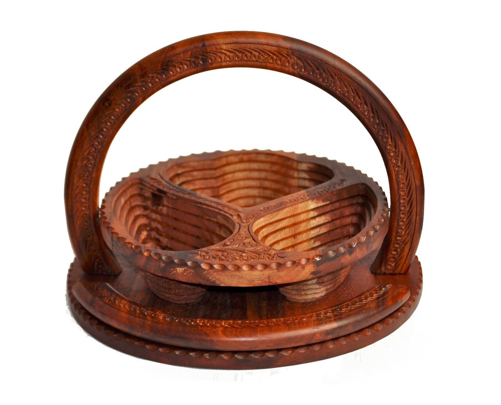 Vintage Hand Carved Wooden Collapsible Fruit Basket Heart Shaped