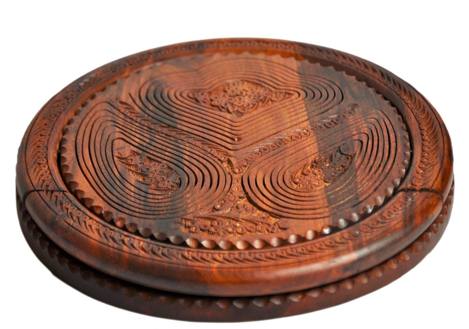 Home/Wooden Basket/Vintage Hand Carved Wooden Collapsible Fruit Basket Heart Shaped 12″ Diameter