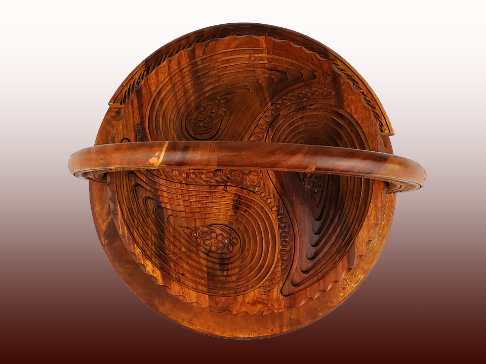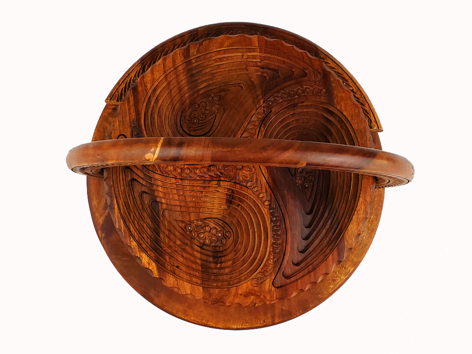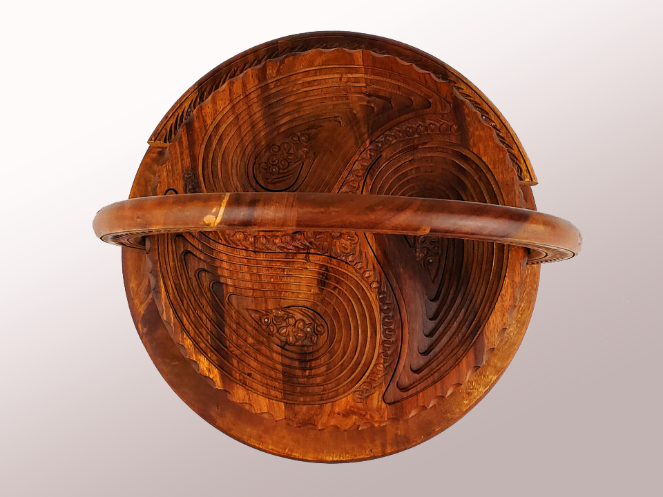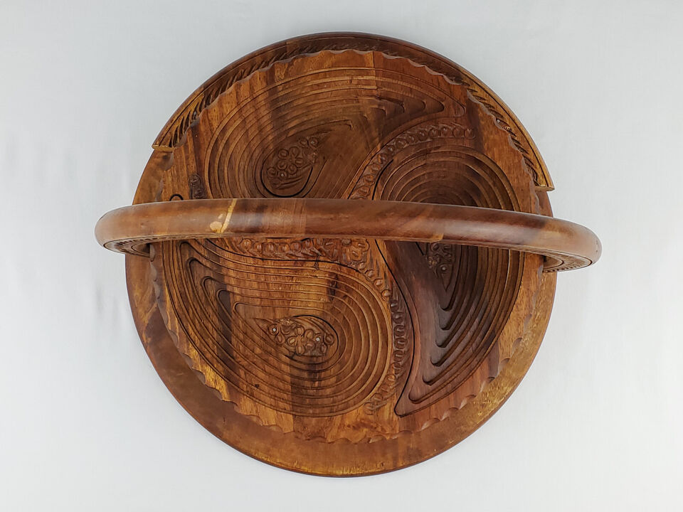 Vintage Hand Carved Wooden Collapsible Fruit Basket Heart Shaped 12″ Diameter