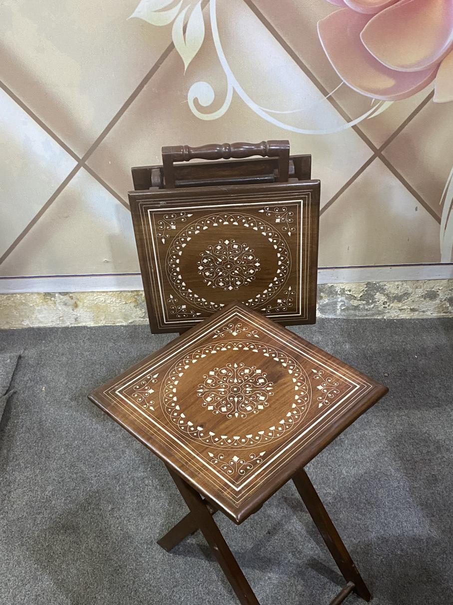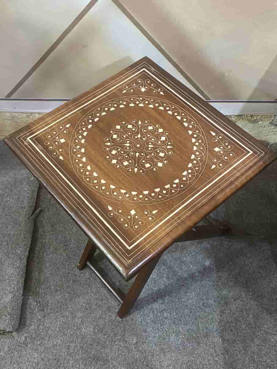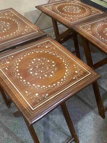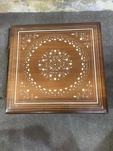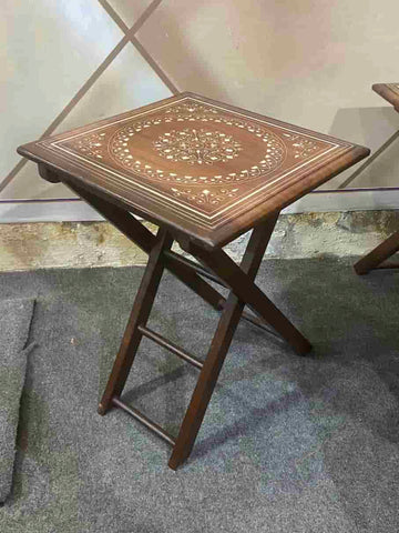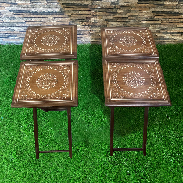 Features: Crafted From Wood in square designDark Brown Finish with White sophistigated ArtSimple Traditional Design with sleek lookEasy To CarryStraight LegsSet of 4Dimensions:Table: 14.5″W x 14.5″D x 19″H