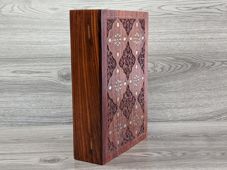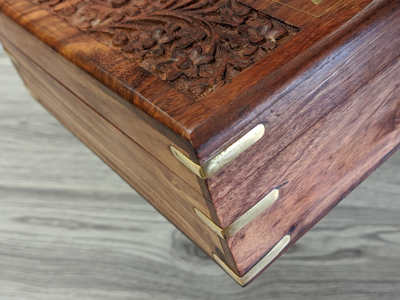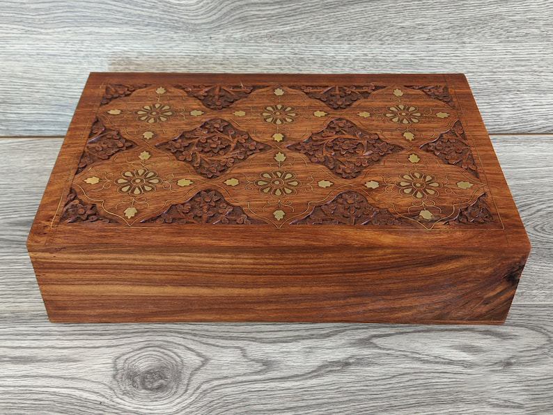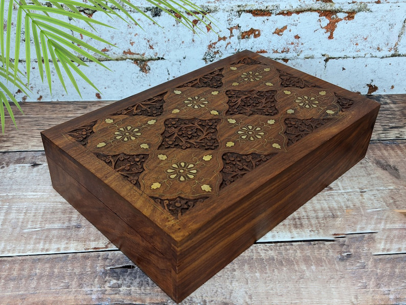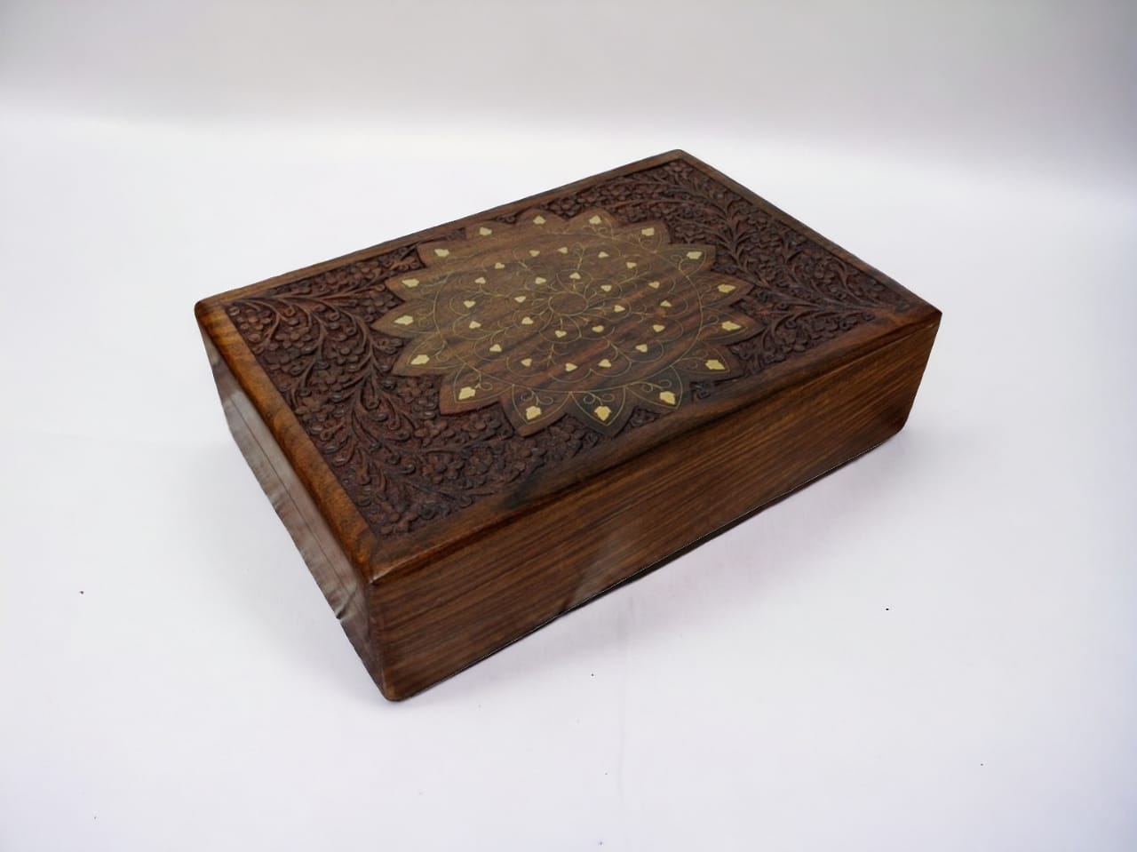 Imagine a wooden box crafted with minimalist elegance, adorned with delicate floral inlay and subtle boho decor elements. This box seamlessly combines functionality with artistic charm, making it an ideal piece for storing jewellery or cherished trinkets. The intricate floral carvings add a touch of natural beauty, while the minimalist design ensures it fits effortlessly into any decor scheme. Whether placed on a bedside table, dresser, or shelf, this box brings a hint of hippie chic to any space.
