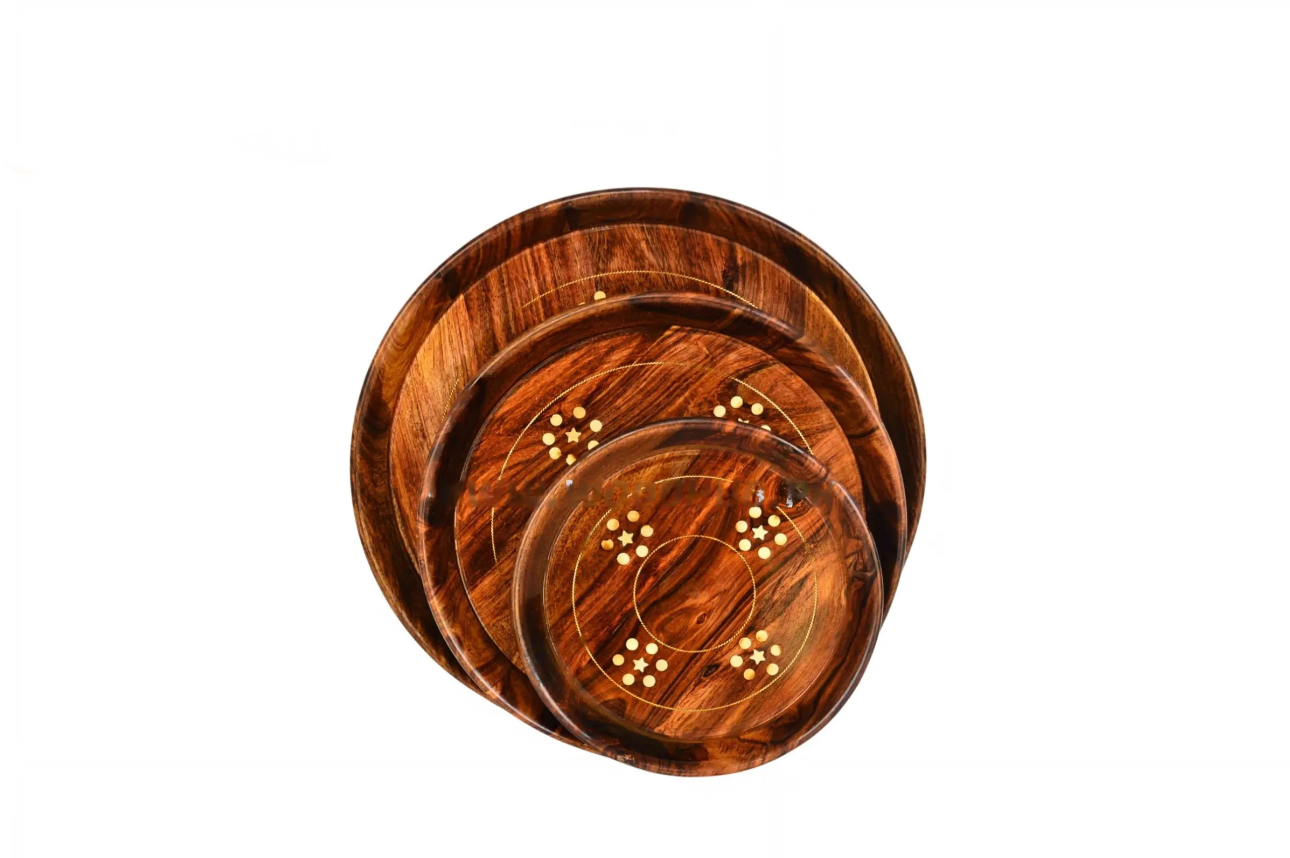 Our Wooden Plates Set Brass Work is designed to be as versatile as it is beautiful. The set includes multiple plates, each showcasing the perfect blend of form and function. Ideal for serving appetizers, main courses, or desserts, these plates are lightweight yet sturdy, making them easy to handle and durable for everyday use. The smooth, polished finish and brass accents not only enhance their visual appeal but also ensure they are easy to clean and maintain.